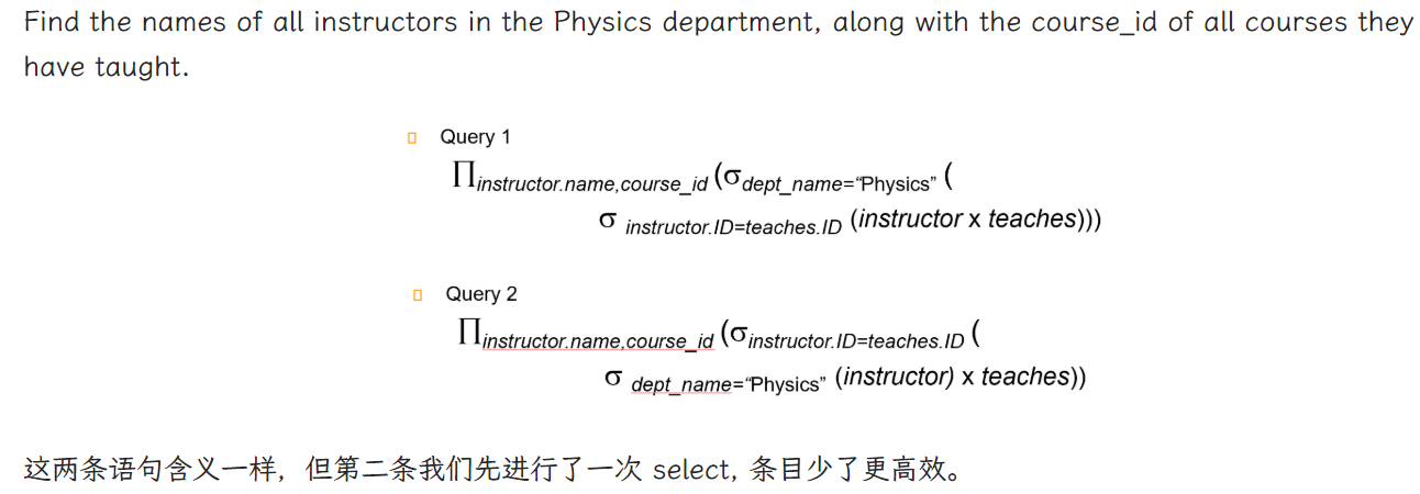 这张图片的核心内容是关于纯关系代数和多集合(多重集)关系代数的区别和定义。具体内容包括: 1. 纯关系代数:移除所有重复项,例如在投影之后。 2. 多集合(多重集)关系代数:保留重复项以匹配SQL语义。 - SQL最初保留重复项是为了效率考虑,但现在这是一个特性。 3. 多集合关系代数的定义如下: - 选择(selection):如果元组满足选择条件,则保留与输入中相同数量的重复元组。 - 投影(projection):每个输入元组产生一个输出元组,即使它是重复的。 - 笛卡尔积(cross product):如果在关系r中有m个t1的副本,在关系s中有n个t2的副本,则在r × s中有m × n个t1.t2的副本。 4. 集合运算符: - 并集(union):m + n个副本。 - 交集(intersection):min(m, n)个副本。 - 差集(difference):min(0, m - n)个副本。 这些概念帮助理解如何在不同的关系代数系统中处理和处理数据,特别是在涉及到重复数据的情况下。