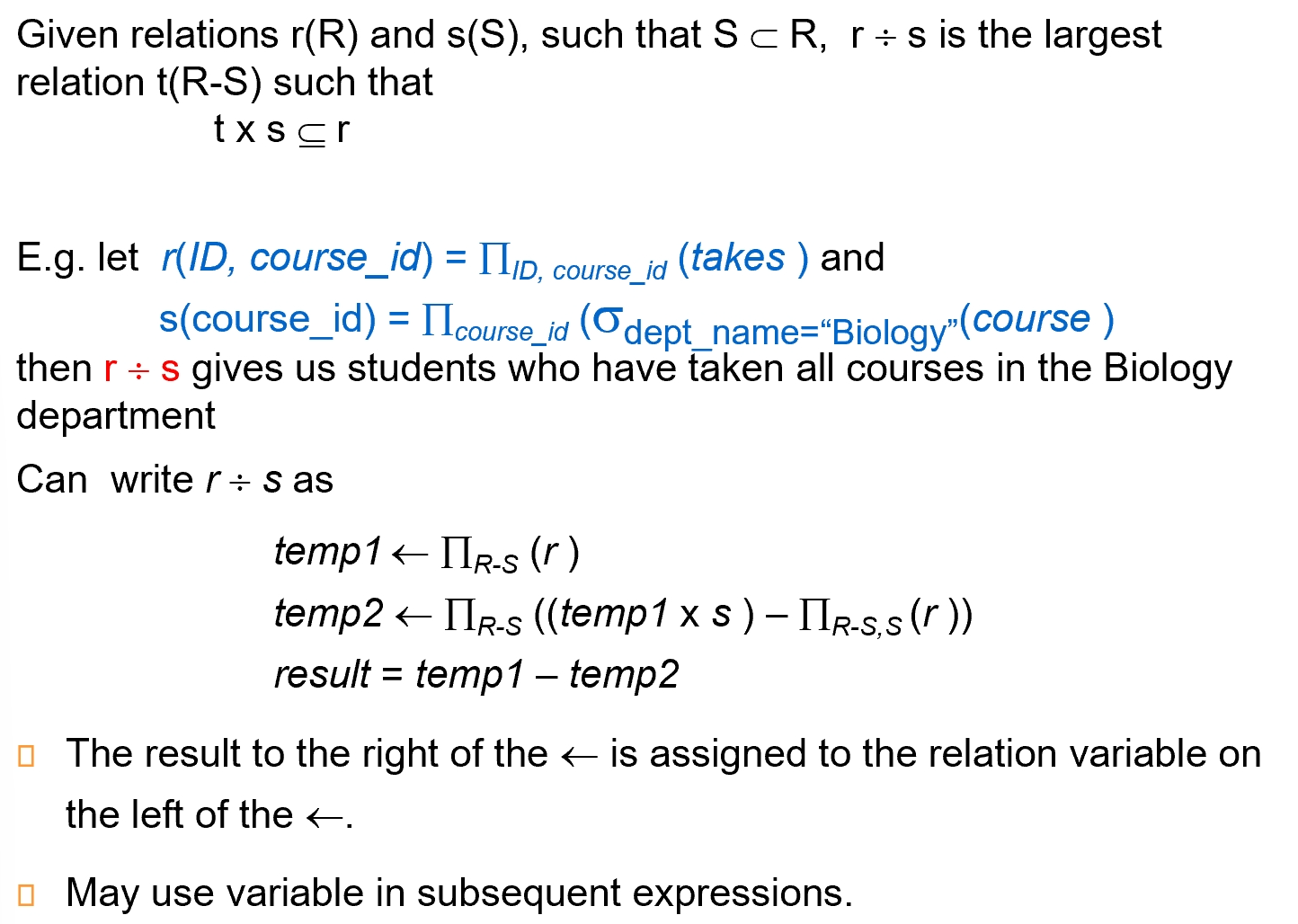 第一个公式配着下面的example比较好理解,r减去((R)和(rs的natural set)的交),也就是左边的列都存在,右边的列内容全部用null补上。第二个工式同理。第三个同同理。