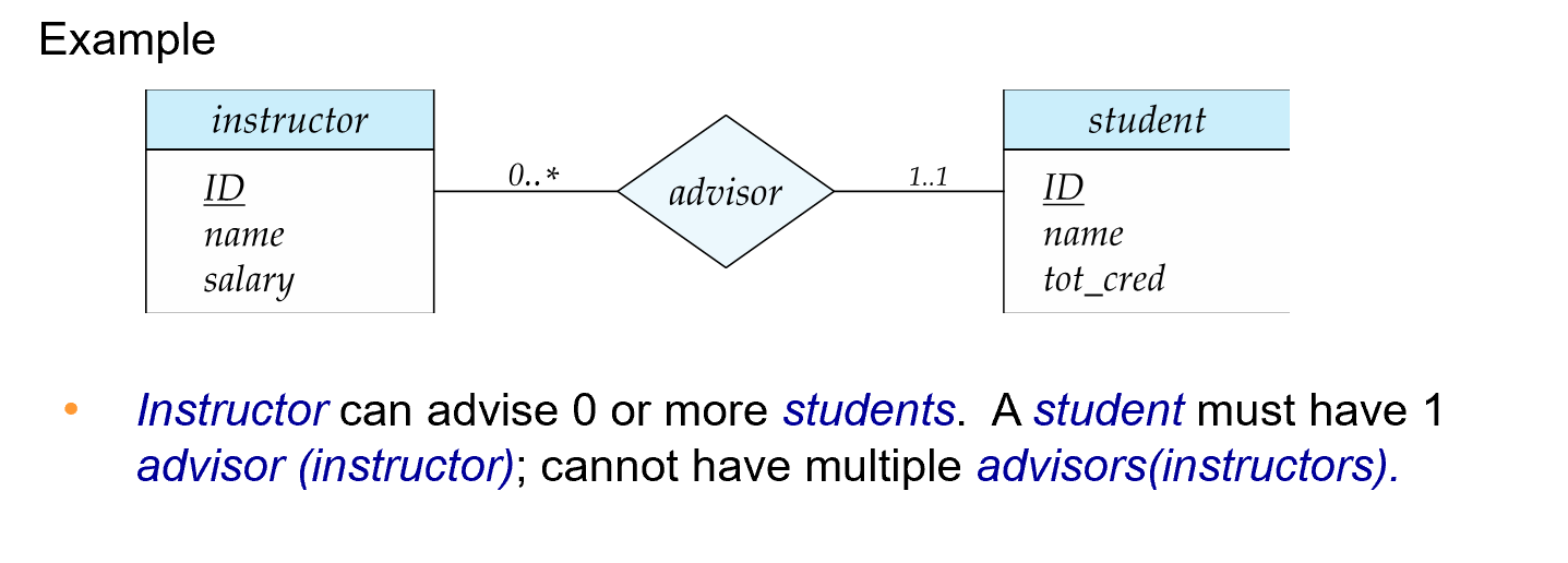 e.g. The advisor relationship set between entity sets instructor and student may have the attribute date which tracks when the student started being associated with the advisor.