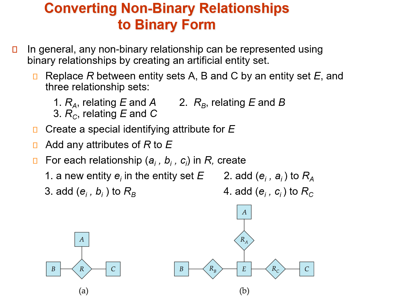 Binary versus n-ary relationship sets Although it is possible to replace any nonbinary (n-ary, for n>2) relationship set by a number of distinct binary relationship sets, a n-ary relationship set shows more clearly that several entities participate in a single relationship.尽管可以用若干不同的二元关系集替换任何非二元(n-ary, for n>2)关系集,但n-ary关系集更清楚地表明多个实体参与单个关系。